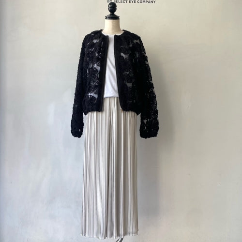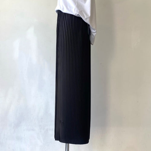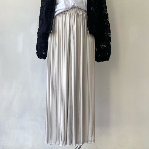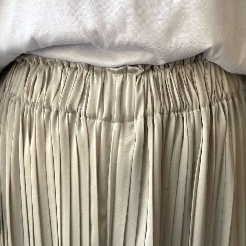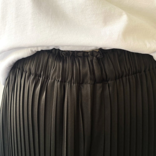 定番のプリーツパンツ。ウエストは総ゴムだからノンストレスです。動くたびに表情の変わる細かなプリーツは目を引きます。サテンの光沢が程よくブラッシュアップされより上品です。軽やかに涼し気に春から夏、秋もニットと合わせやすく3シーズンたっぷり履けるパンツです。