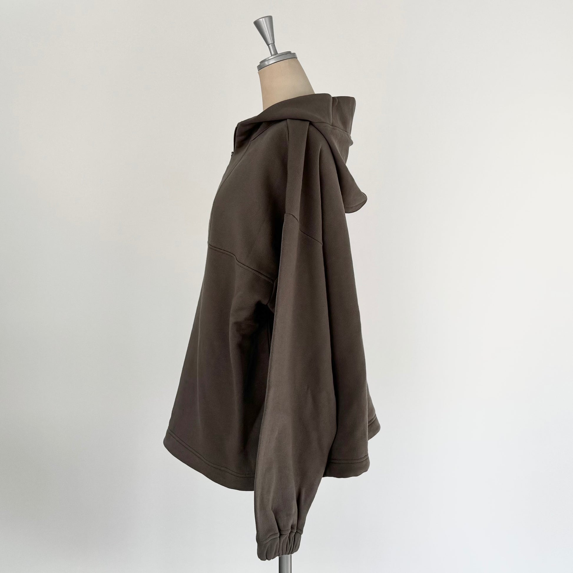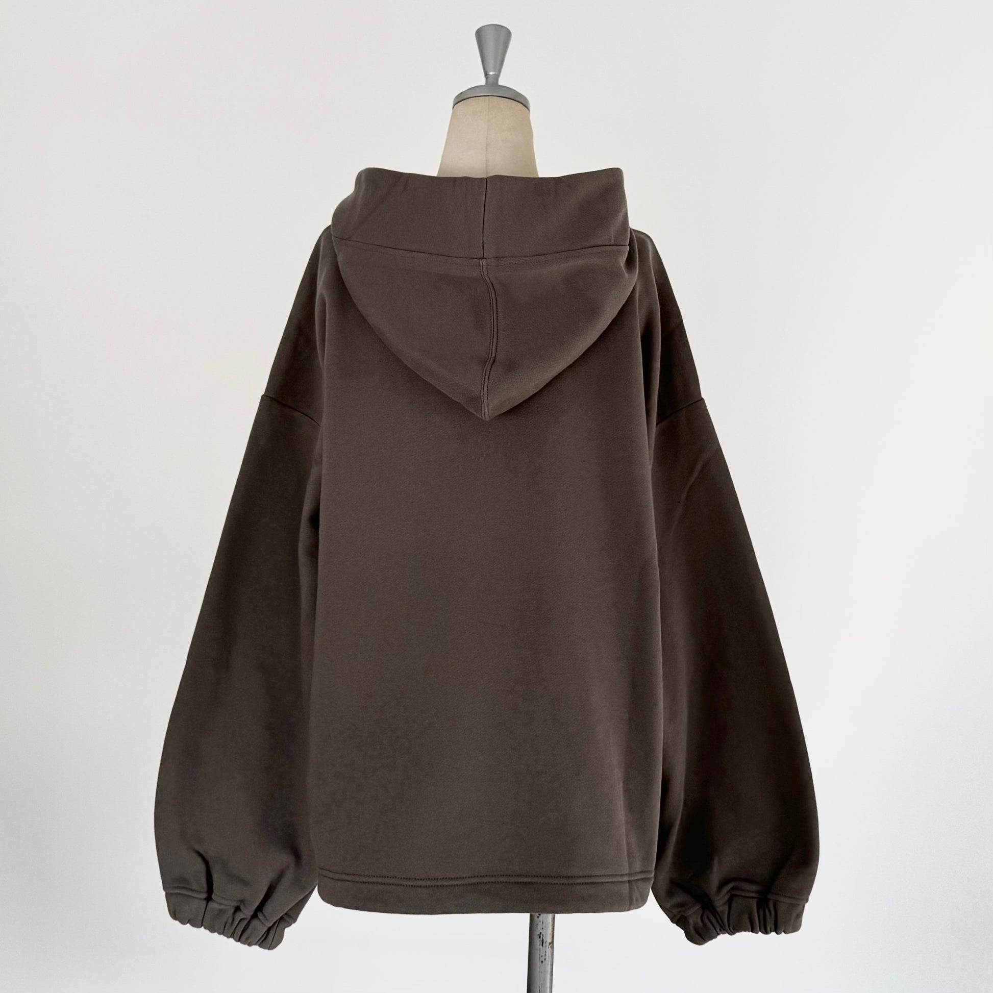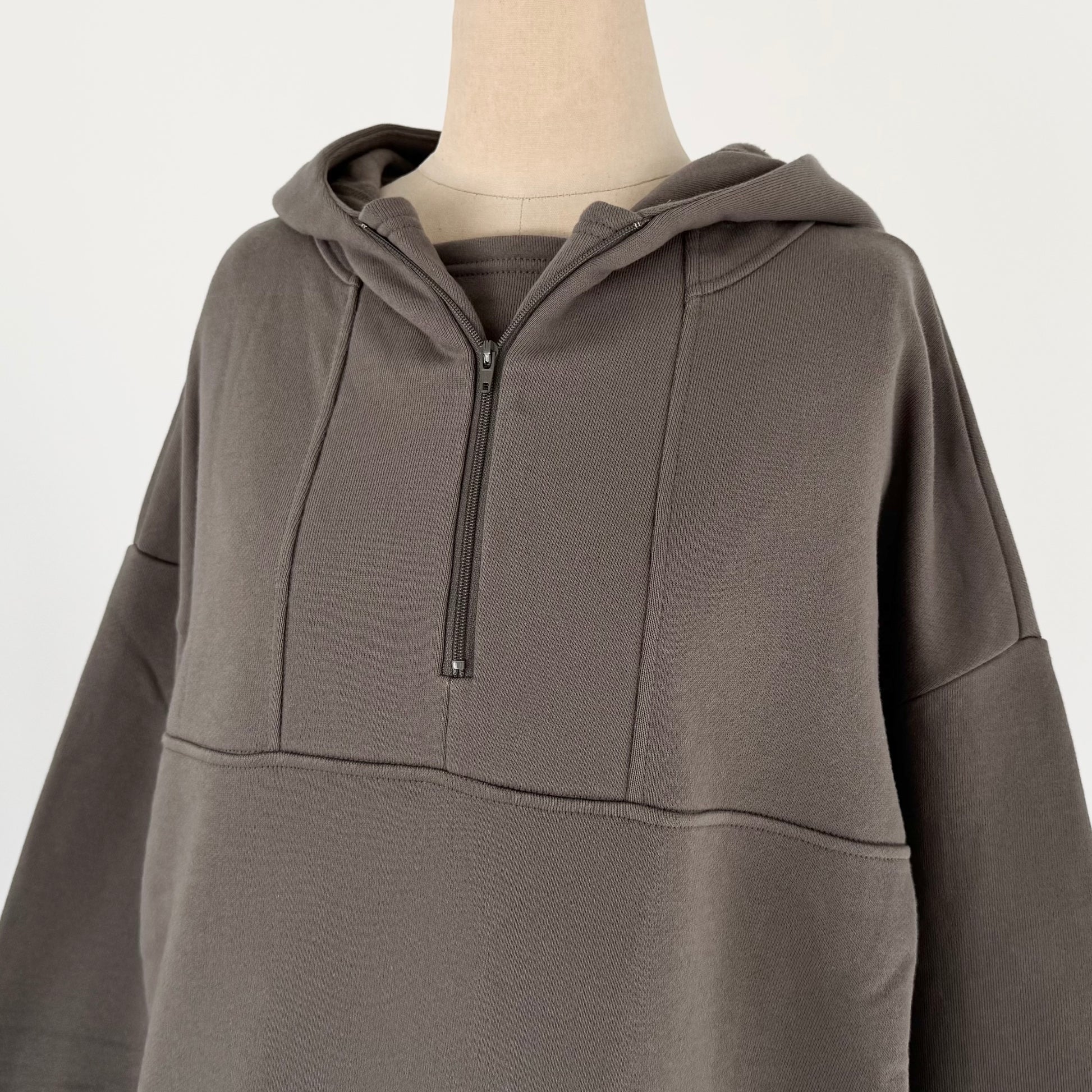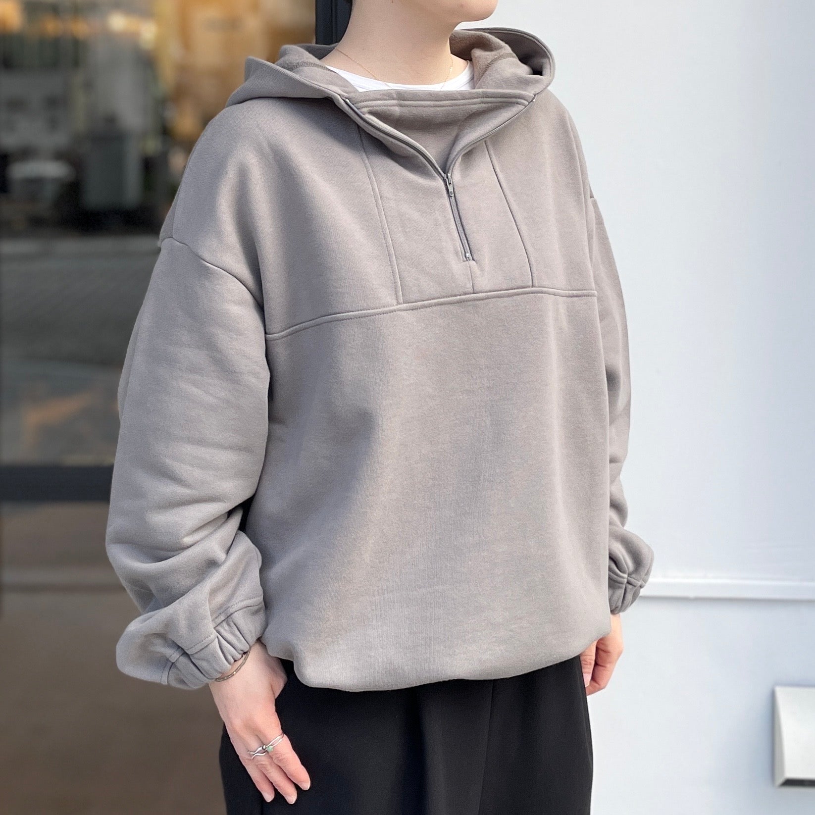 コットン100%の裏起毛素材のフードパーカー。スポーティーでありながら女性らしさのあるたぽんとしたシルエット。パンツに合わせてもスカートに合わせても素敵に着こなせます。フロントのハーフジップや裾のドローコードで絞れるデザインも魅力的。裏起毛の綿素材で本格的な冬も暖かく、春先まで長く着ていただけます。