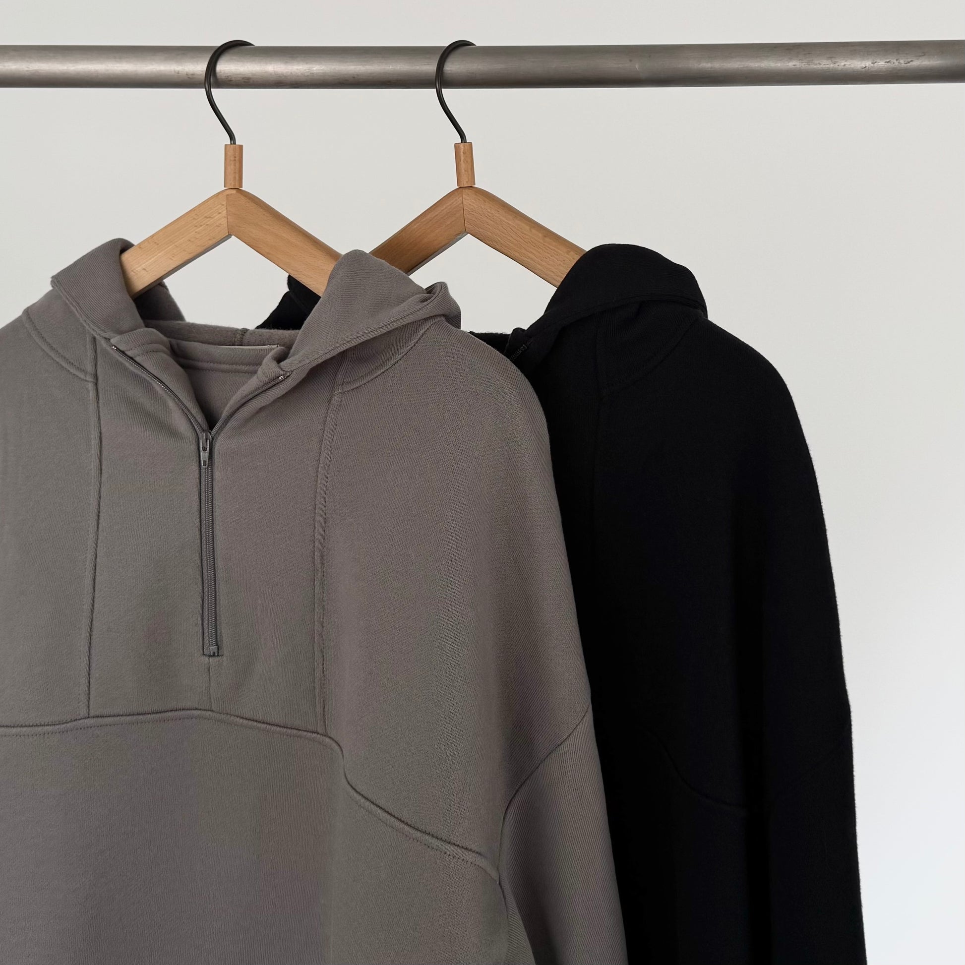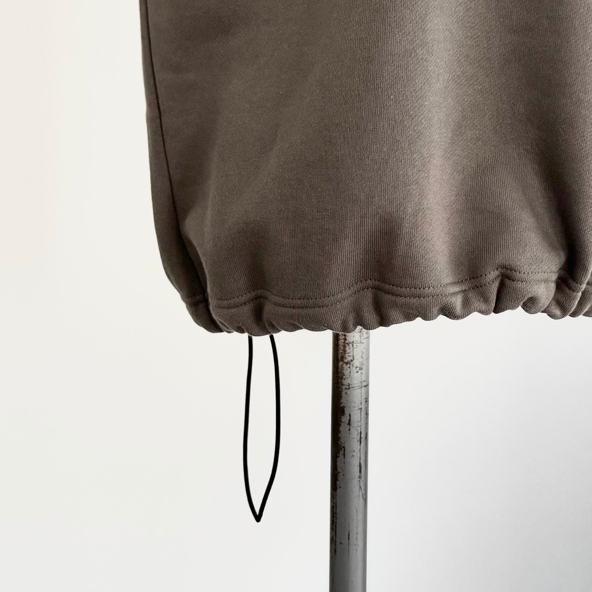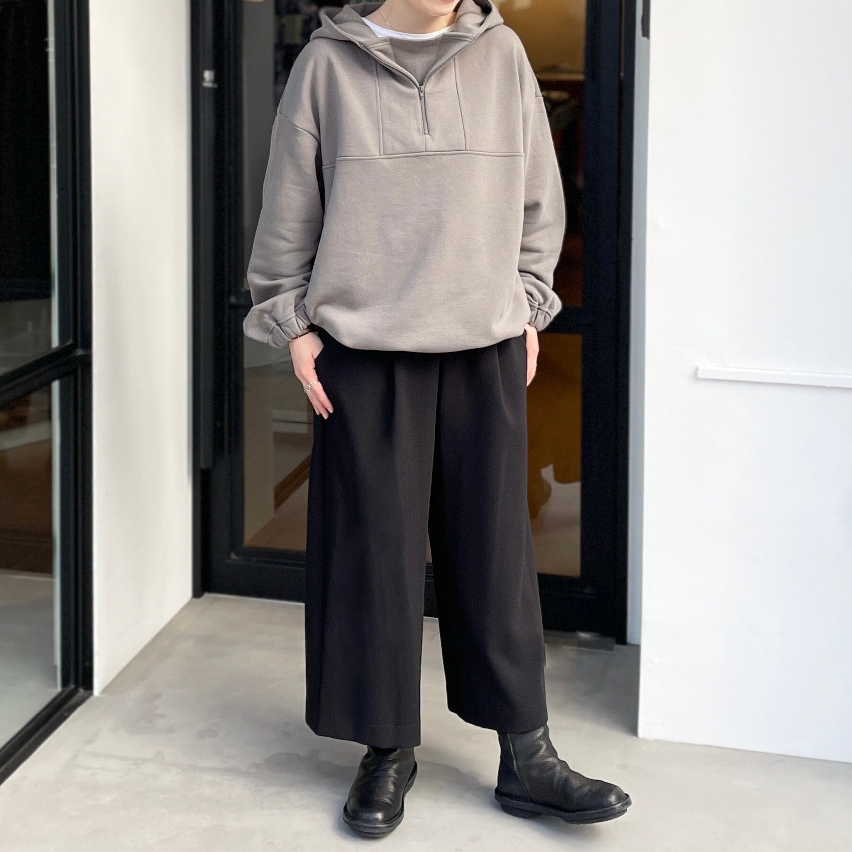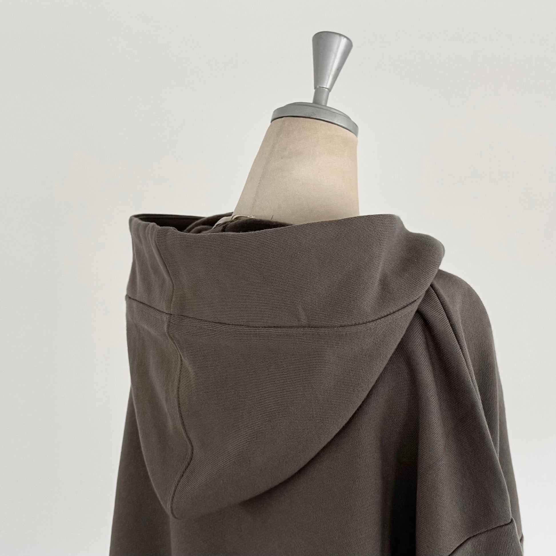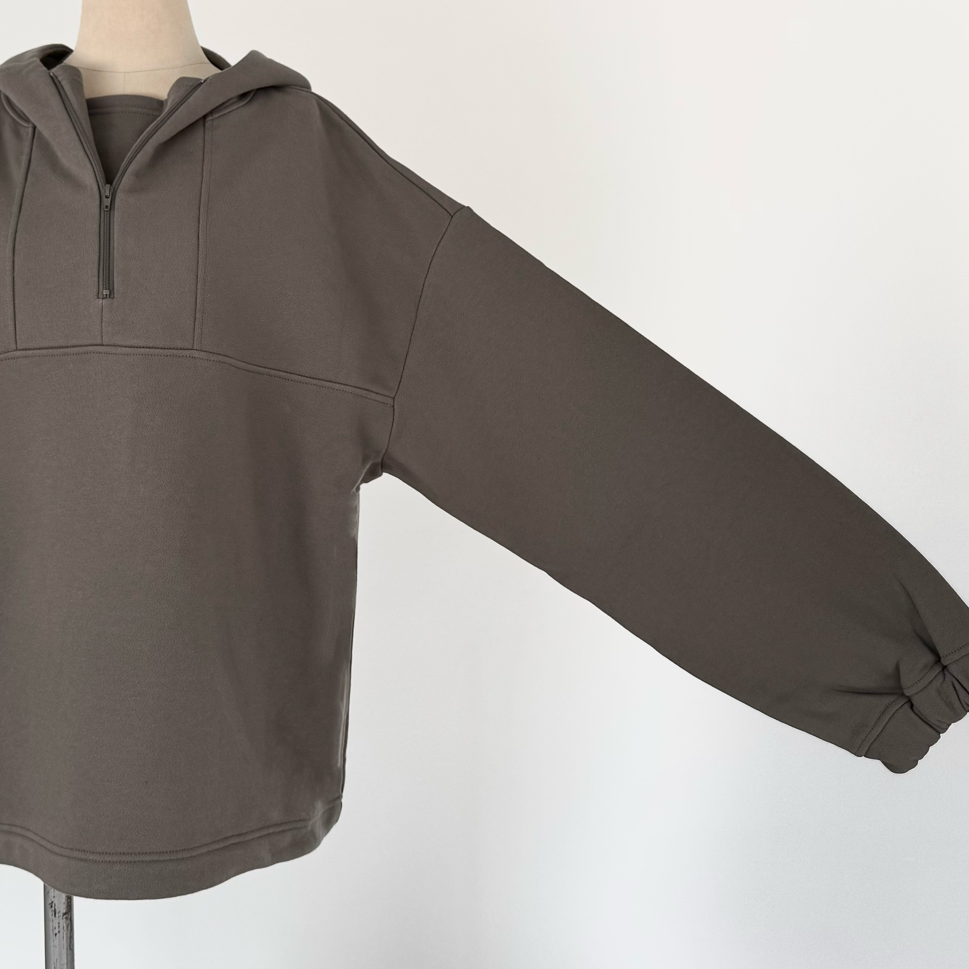コットン100%の裏起毛素材のフードパーカー。スポーティーでありながら女性らしさのあるたぽんとしたシルエット。パンツに合わせてもスカートに合わせても素敵に着こなせます。フロントのハーフジップや裾のドローコードで絞れるデザインも魅力的。裏起毛の綿素材で本格的な冬も暖かく、春先まで長く着ていただけます。