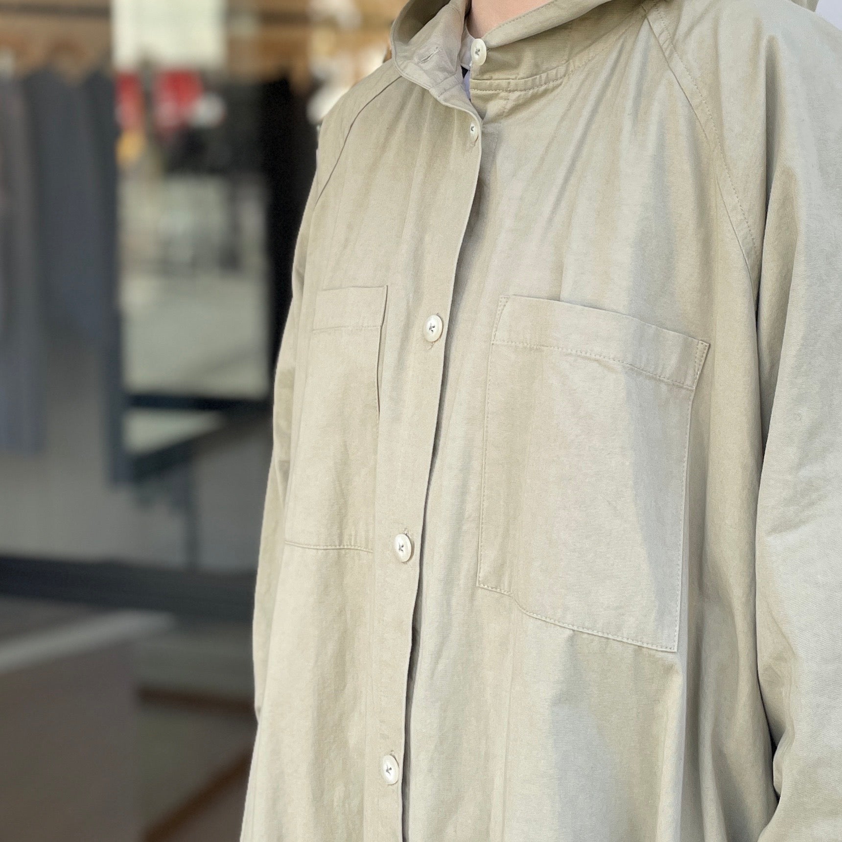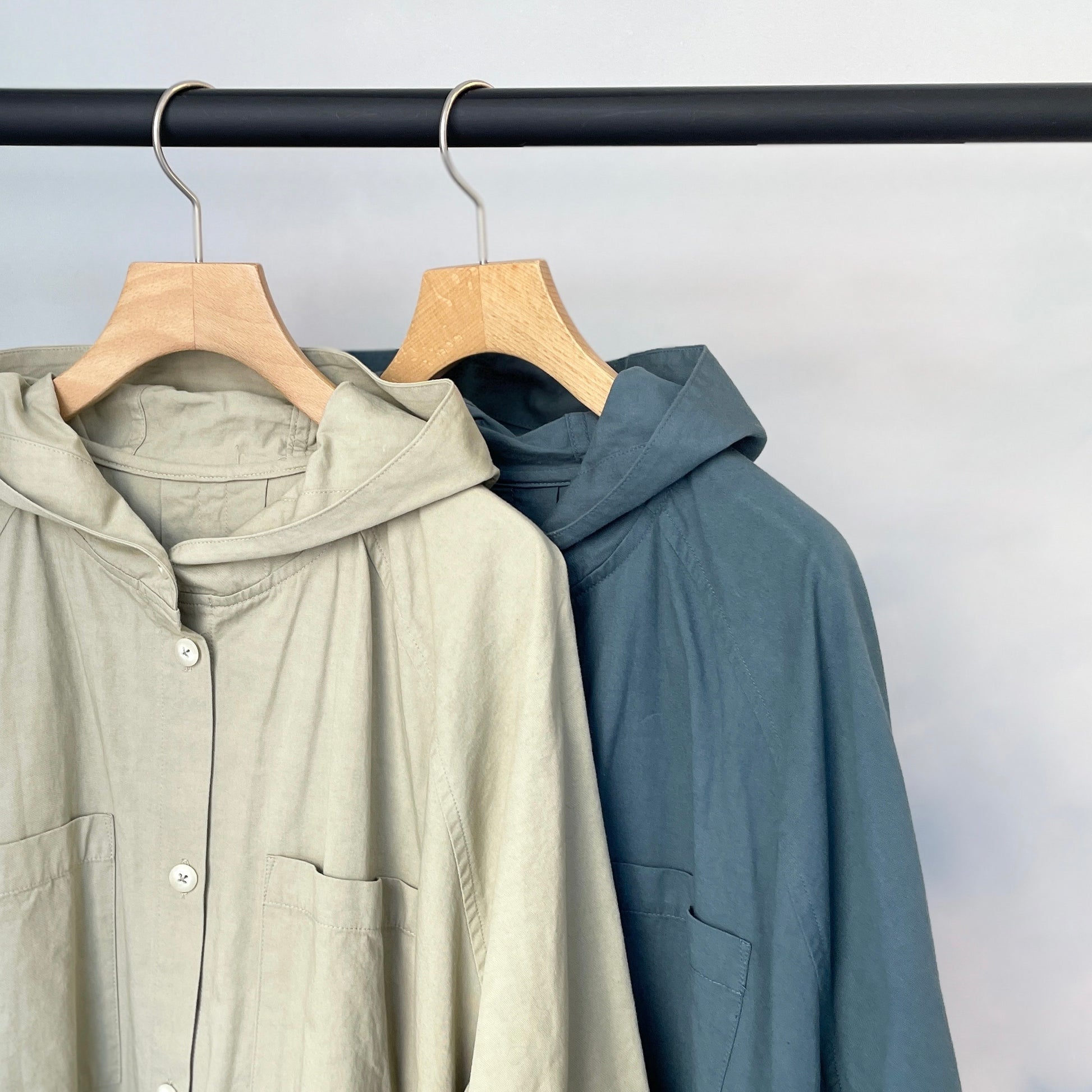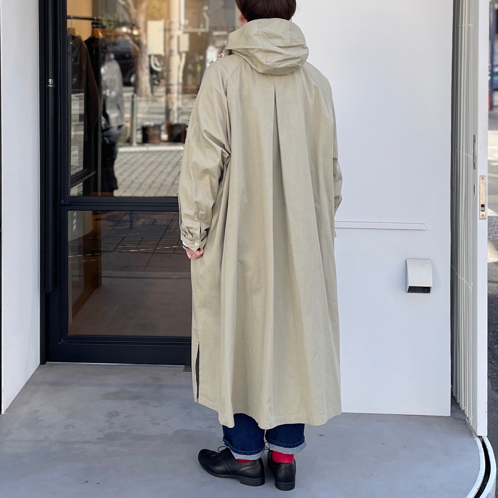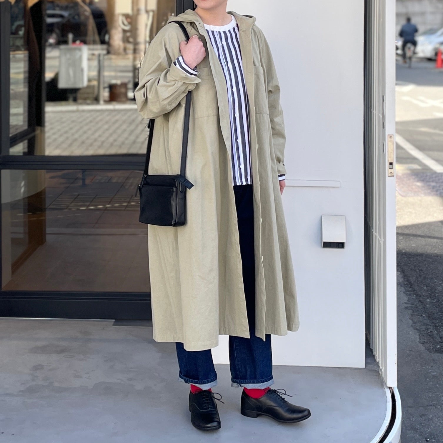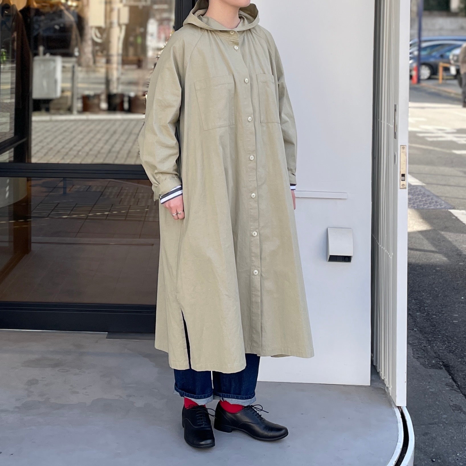 コットンの適度なハリ感と柔らかさのあるスプリングコート。ラグランスリーブで肩周りにゆとりがあり、厚手のニットやトレーナーの上に羽織っても嵩張りません。ボタン仕様で開けてロングシャツのように着れるのも〇しっかりと肩に自立してくれる小ぶりなフードや少し長めな着丈でこなれた雰囲気を出してくれます。