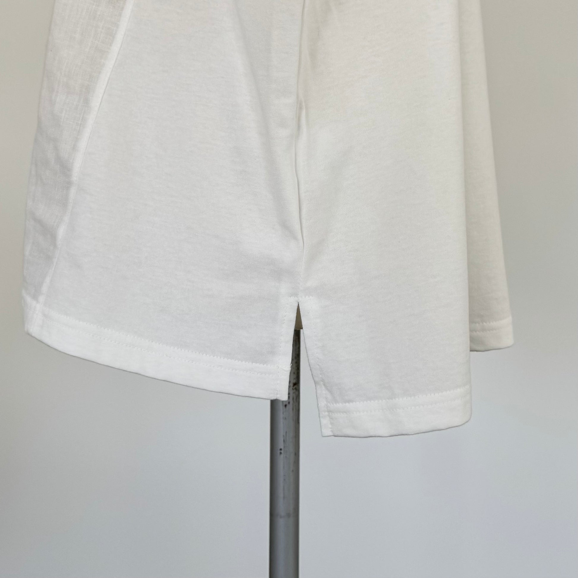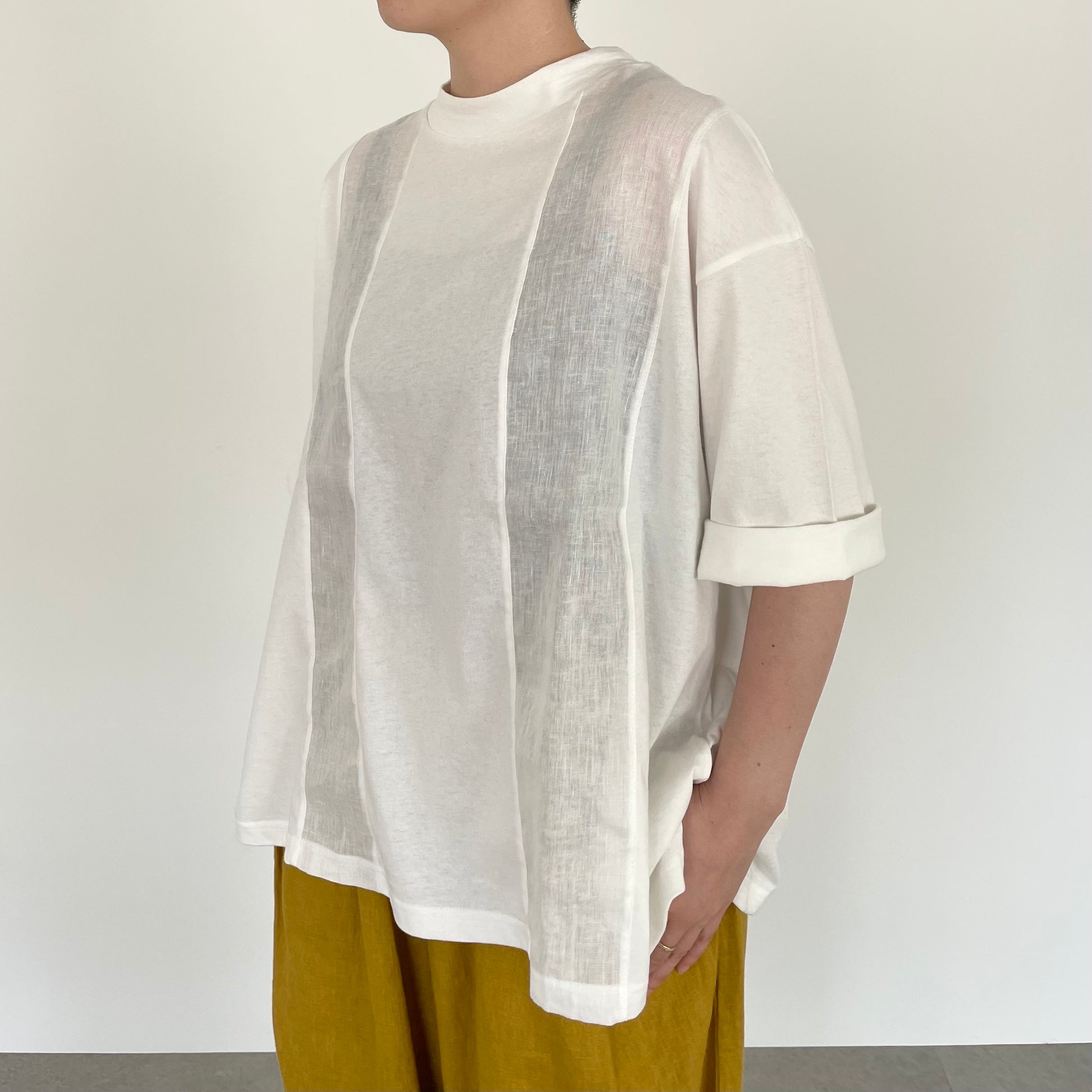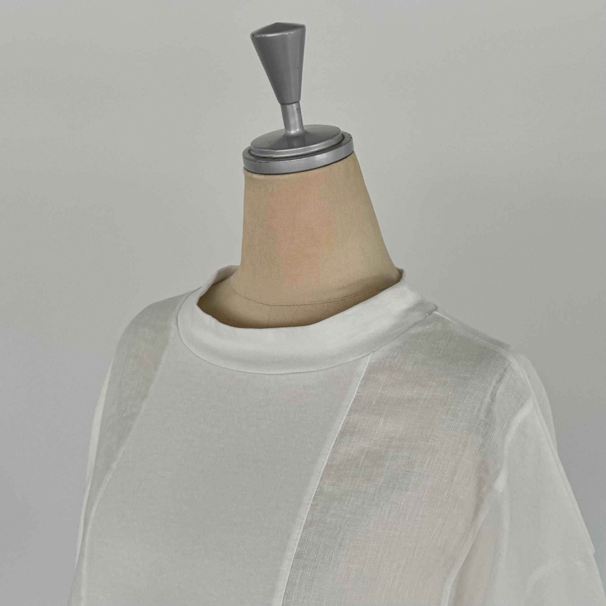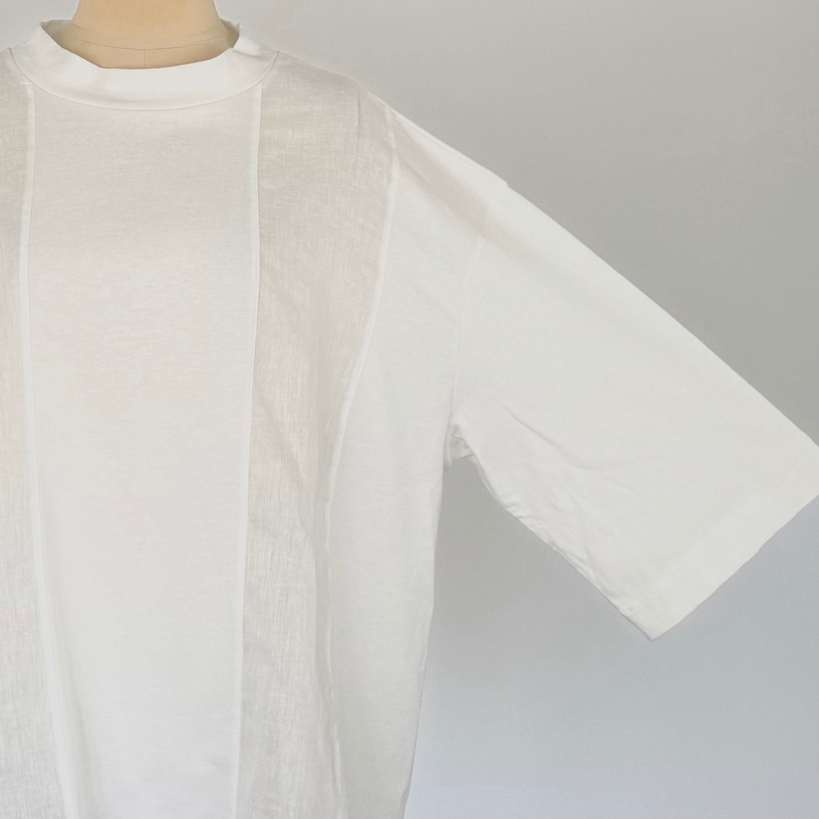 綿と麻のパッチワークデザインが目を惹くTシャツ。適度な首の詰まりと麻の縦ラインが体をスッキリ見せてくれます。異素材の切り替えがおもしろくオシャレな1枚として着こなせます。