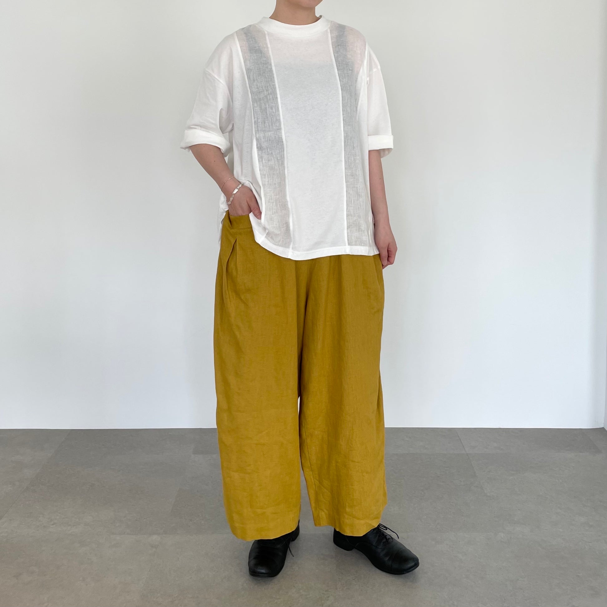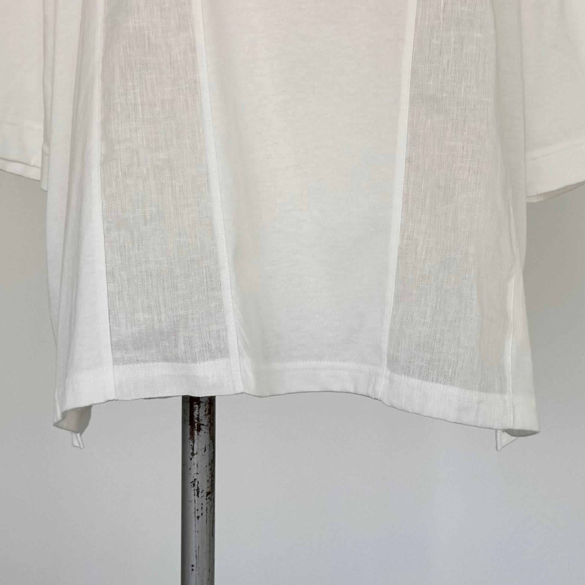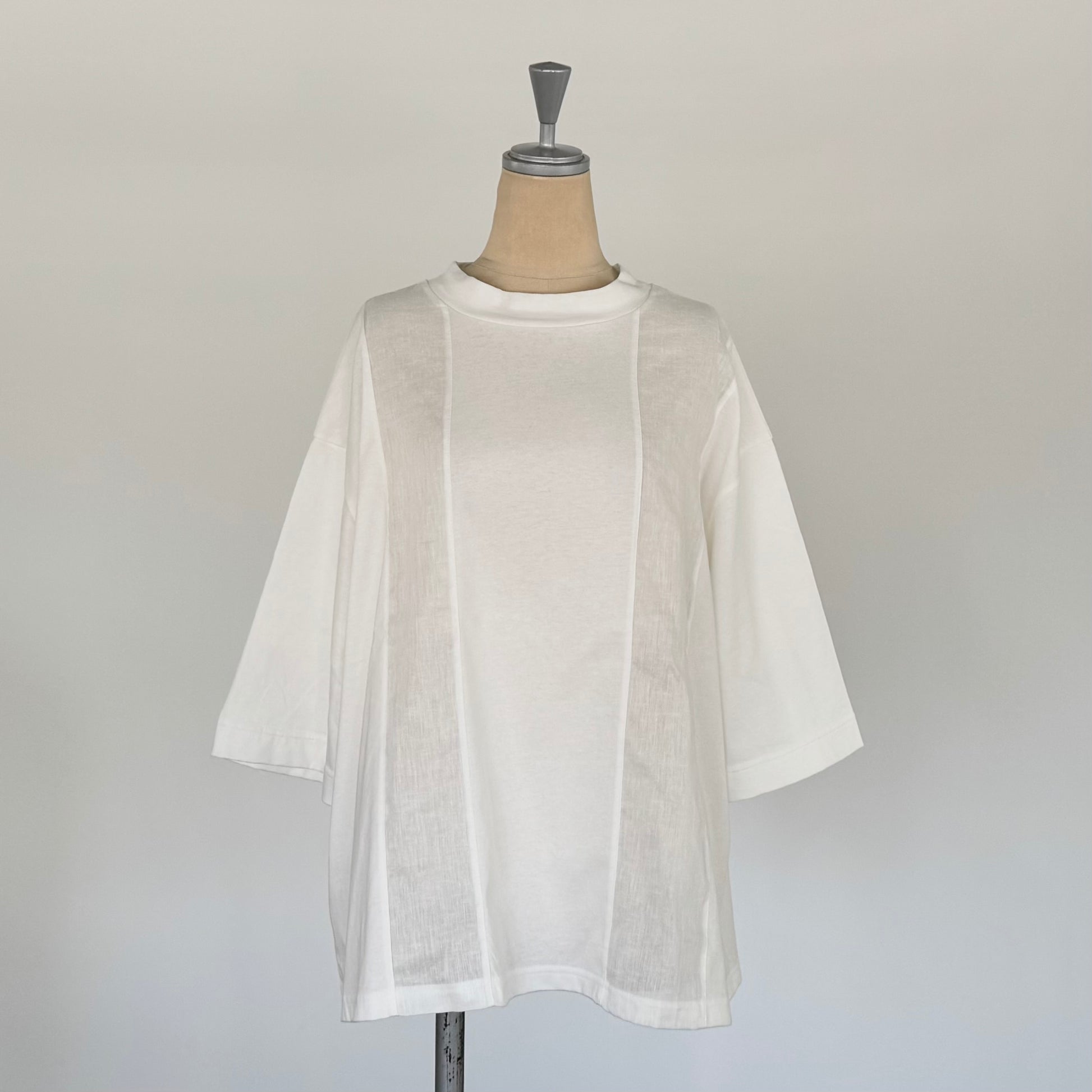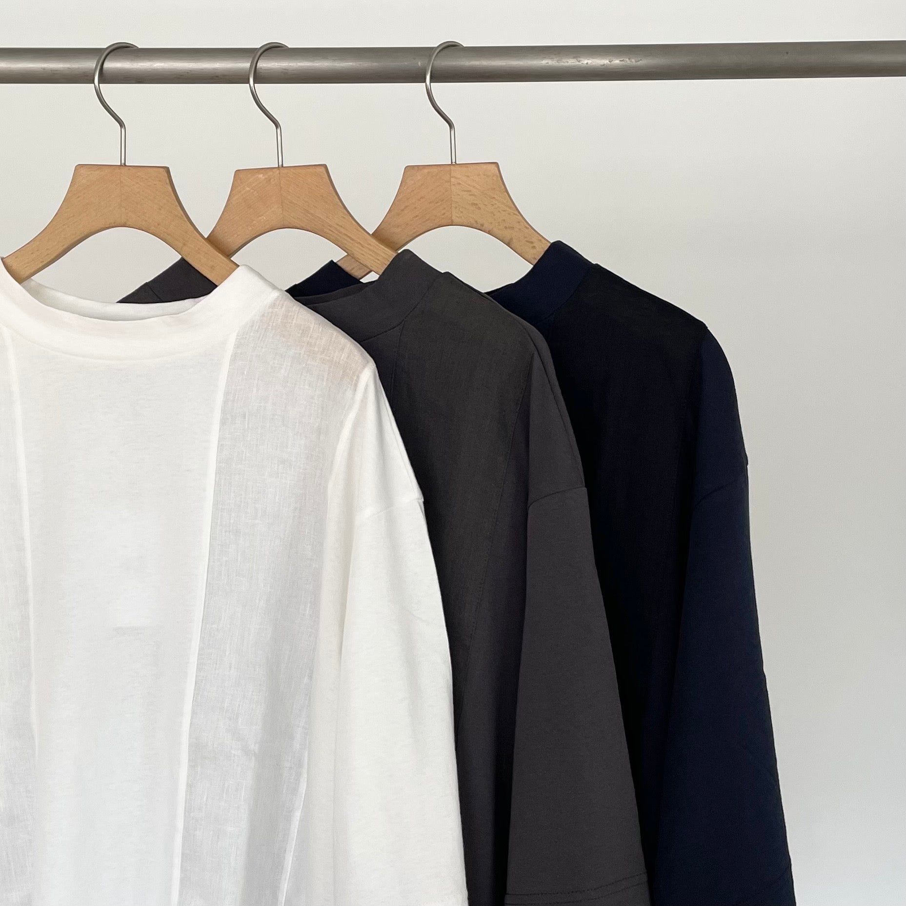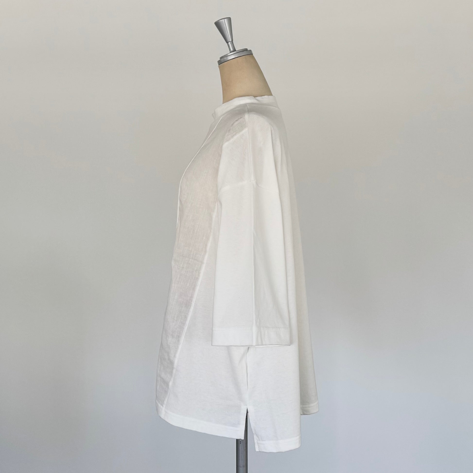 綿と麻のパッチワークデザインが目を惹くTシャツ。適度な首の詰まりと麻の縦ラインが体をスッキリ見せてくれます。異素材の切り替えがおもしろくオシャレな1枚として着こなせます。