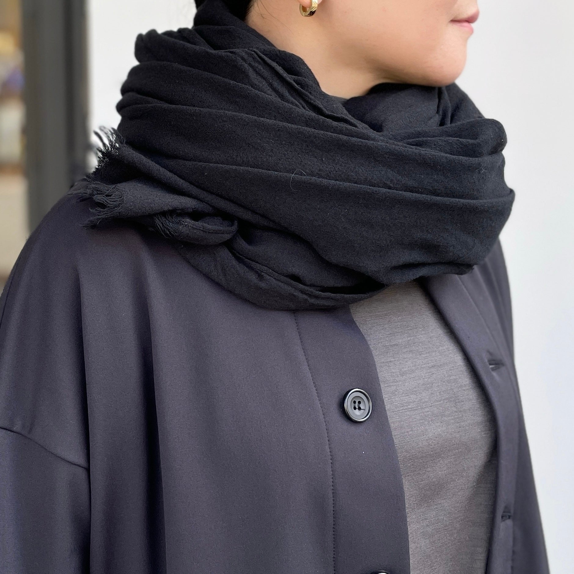 首元を温めコーディネートのアクセントにもなる大判ストール。ウールとコットン半分ずつのガーゼのような生地感だからこそ春先まで長く活躍してくれます。ぐるぐると巻いてボリュームもちょうど良く、一周巻いて垂らしてもOK!!裾のフリンジも素敵に見せてくれるポイントです。ご家庭でお洗濯可能なので、日常で気兼ねなくお使いいただけます。