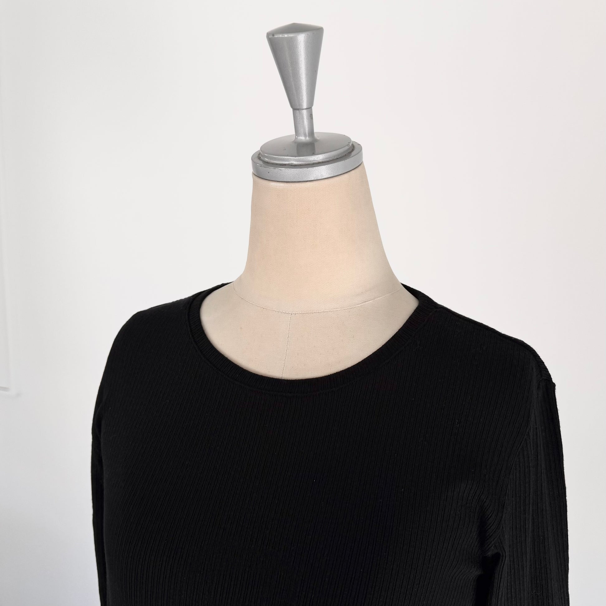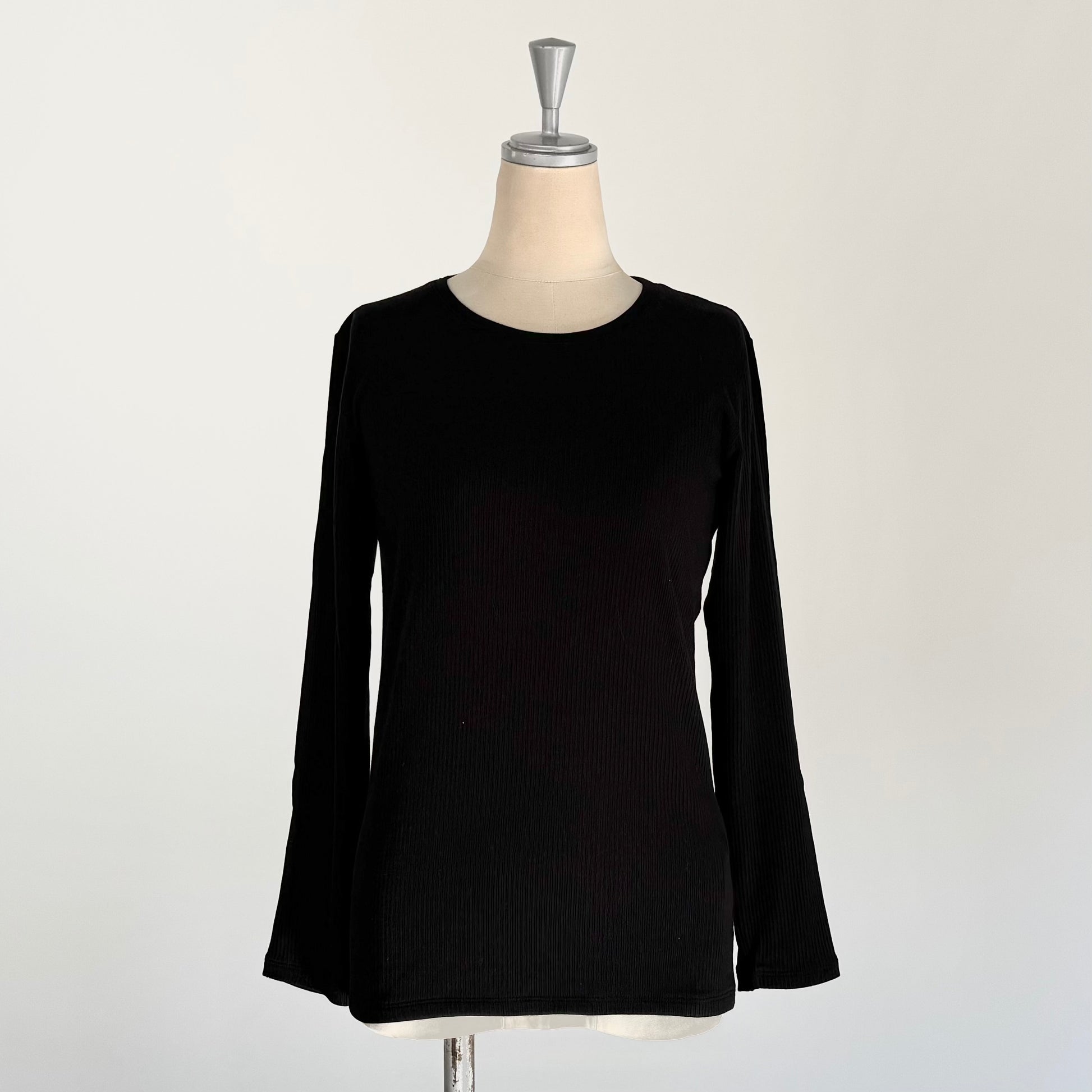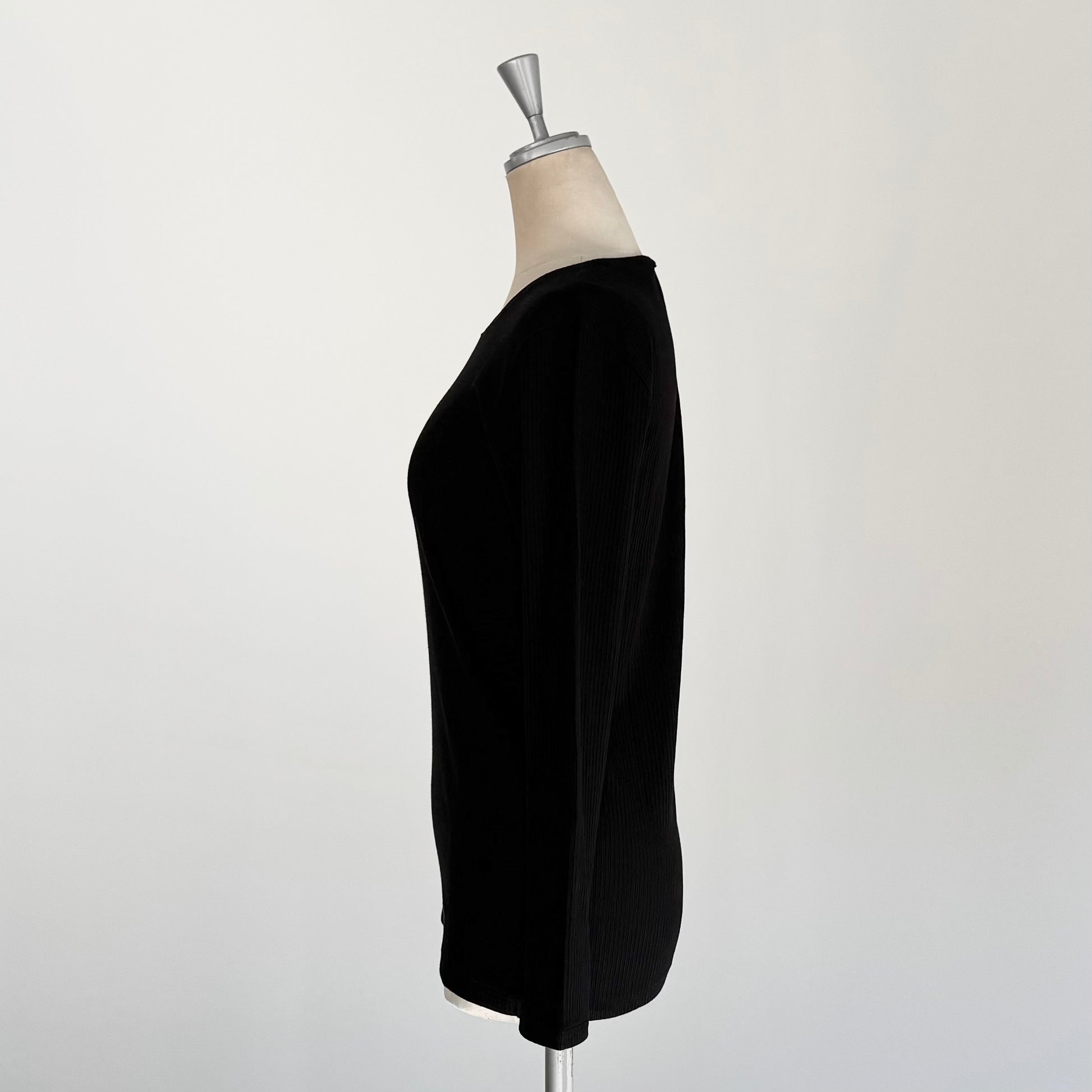 カシミヤシルク混のとても着心地の良いリブクルーネックインナー。薄手ながらもしっかりと暖かい。窮屈感はなく適度にフィットしてくれるのでブラウスやトレーナーの下に着てももたつきません。鎖骨に沿ってくれるような首の開きで、スッキリ着ていただけます。