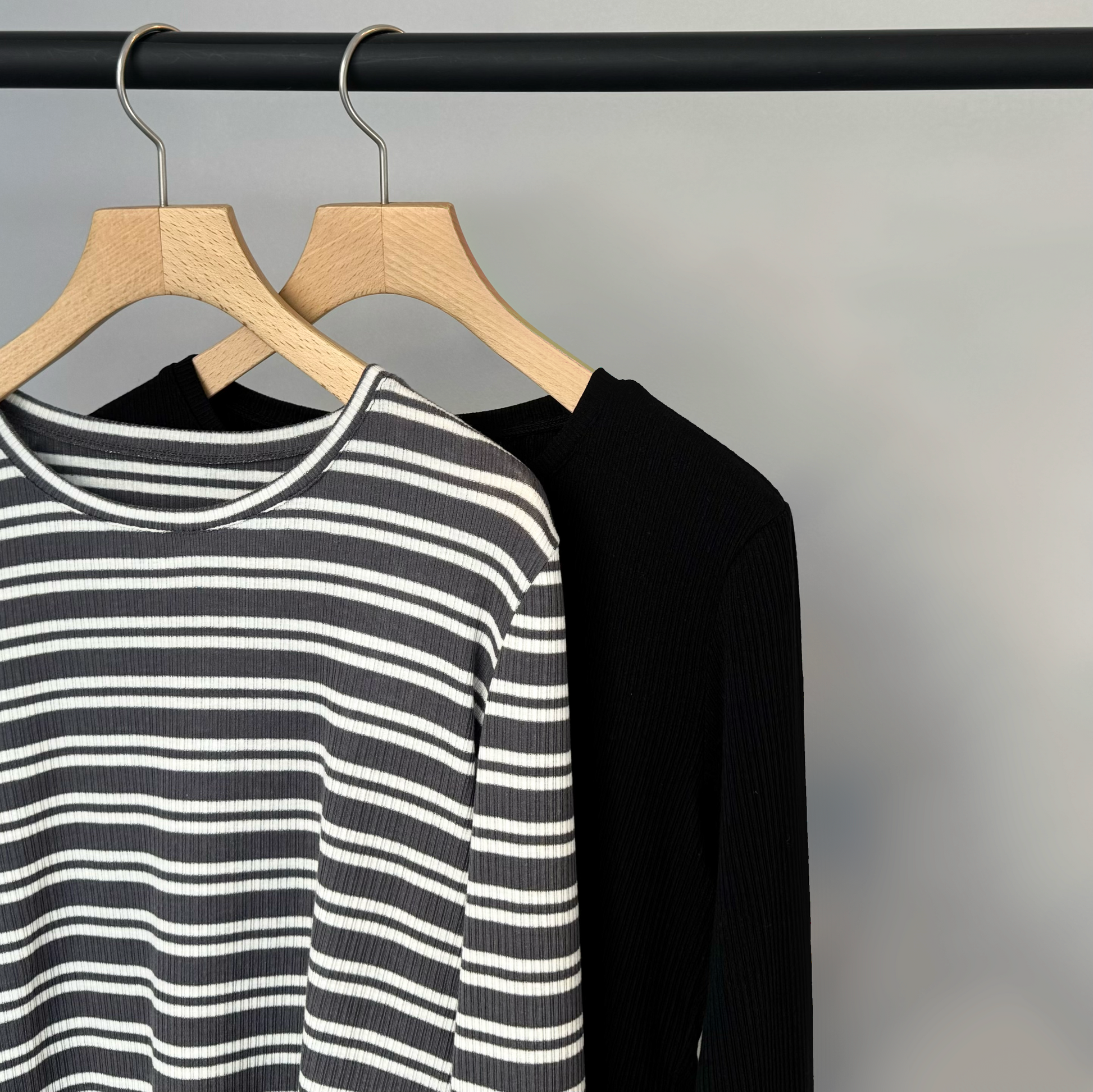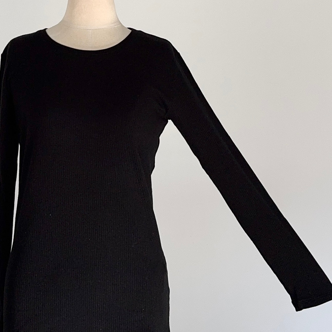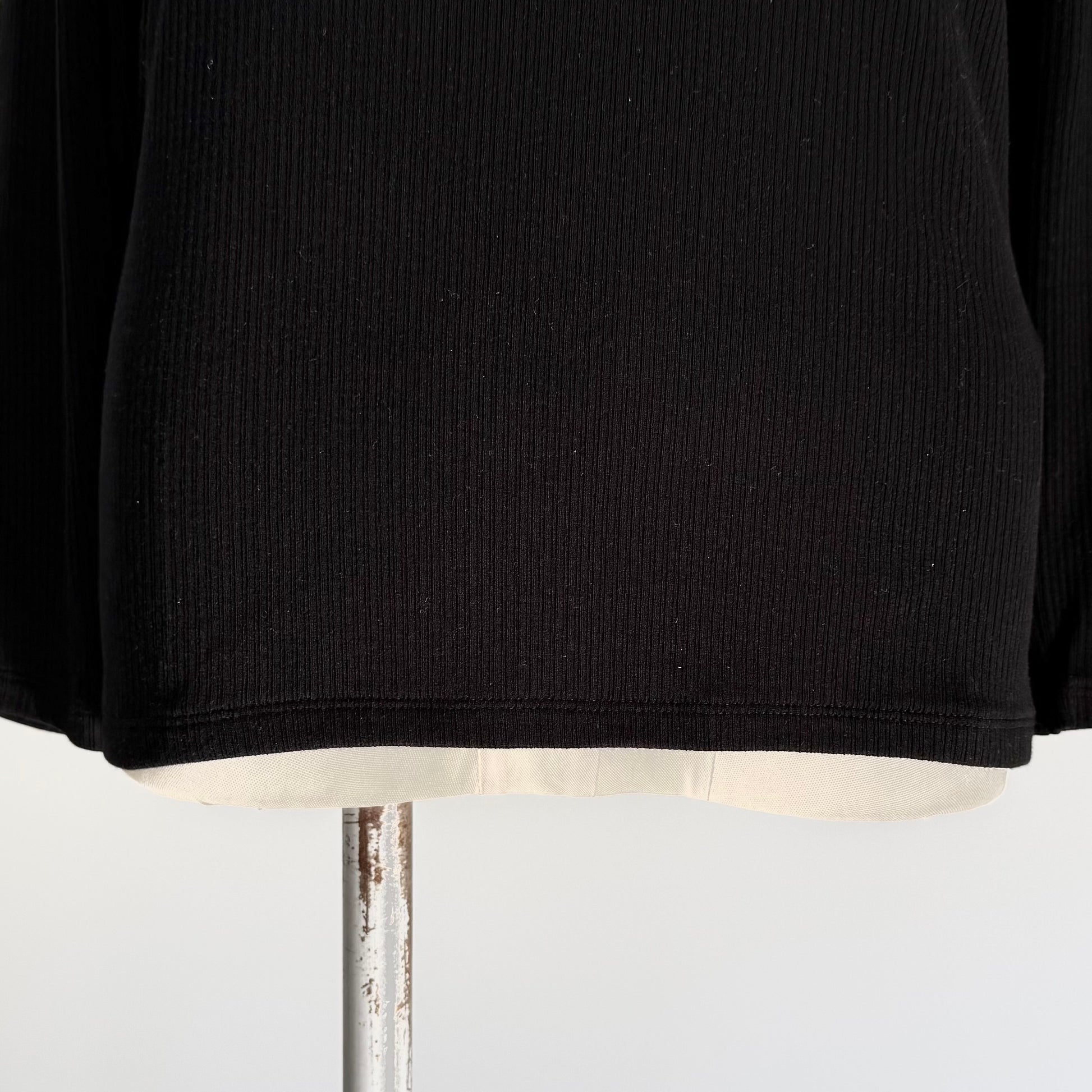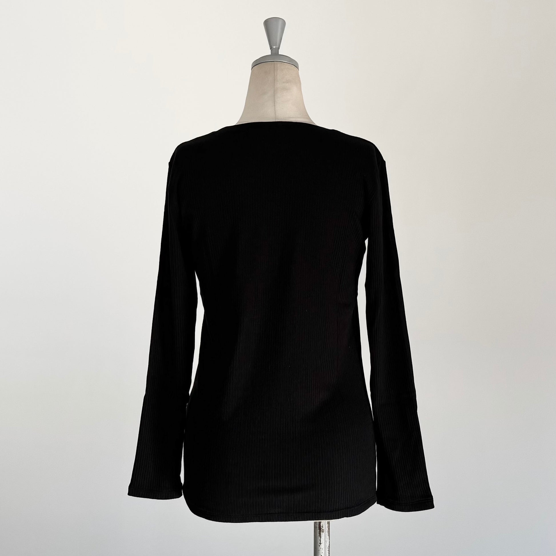 カシミヤシルク混のとても着心地の良いリブクルーネックインナー。薄手ながらもしっかりと暖かい。窮屈感はなく適度にフィットしてくれるのでブラウスやトレーナーの下に着てももたつきません。鎖骨に沿ってくれるような首の開きで、スッキリ着ていただけます。