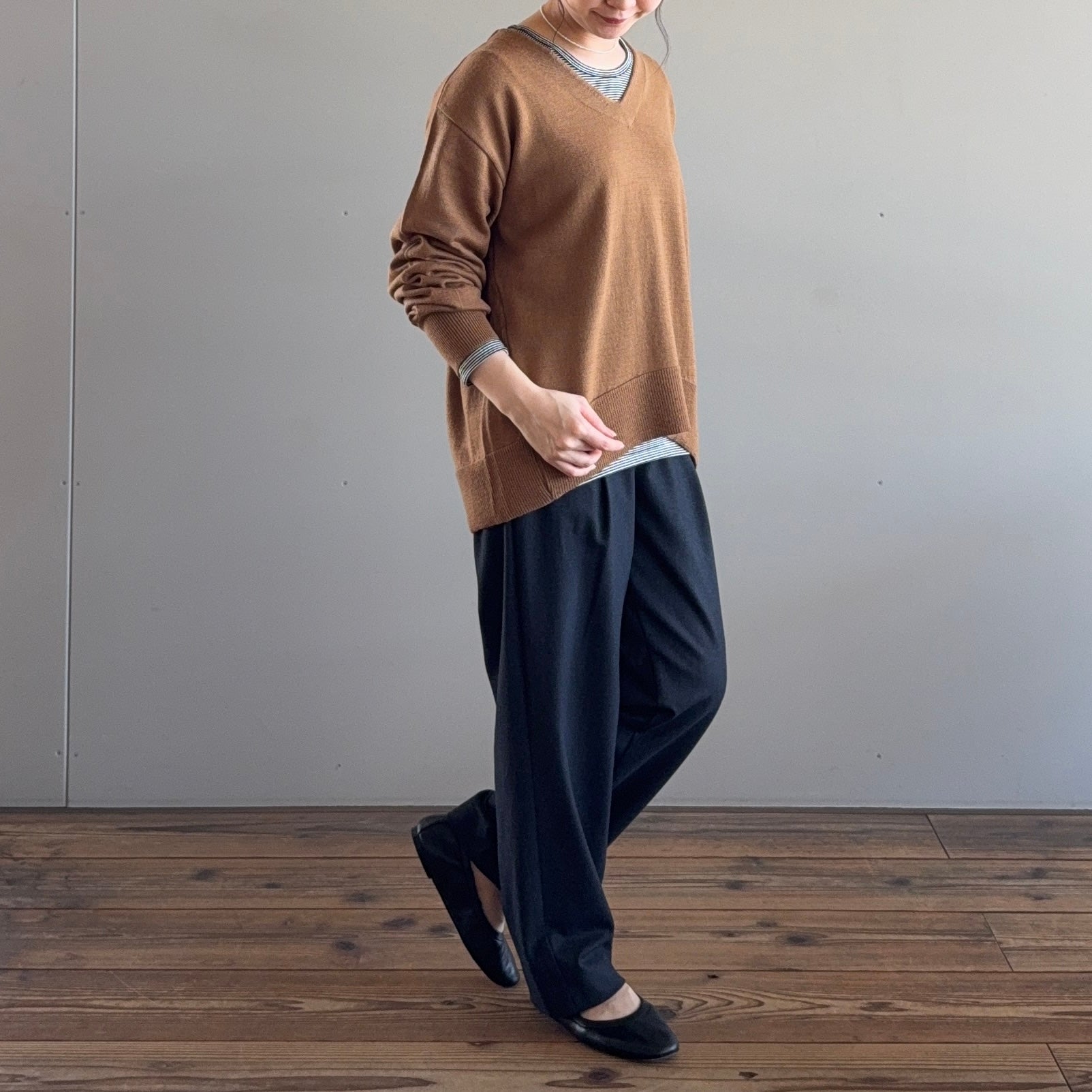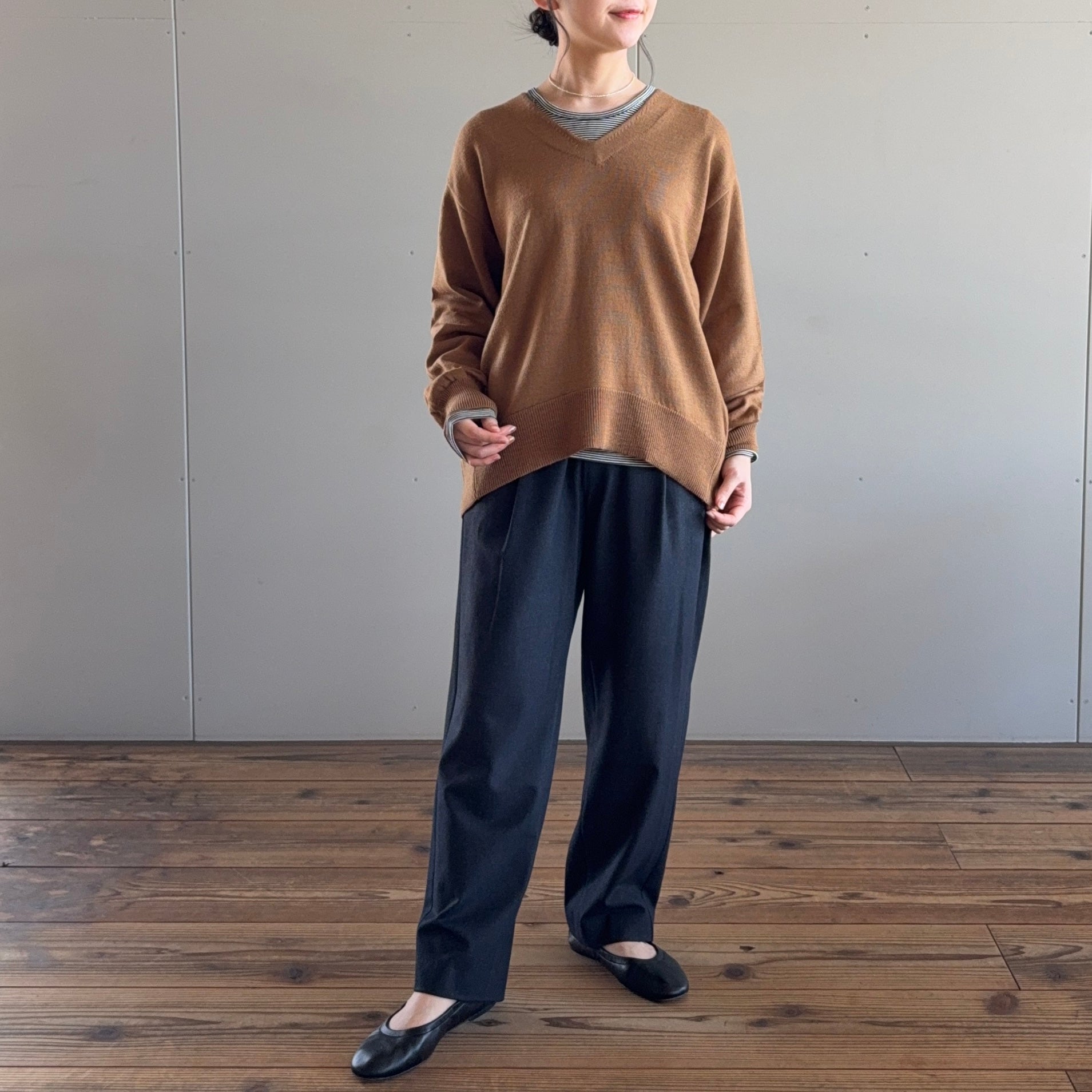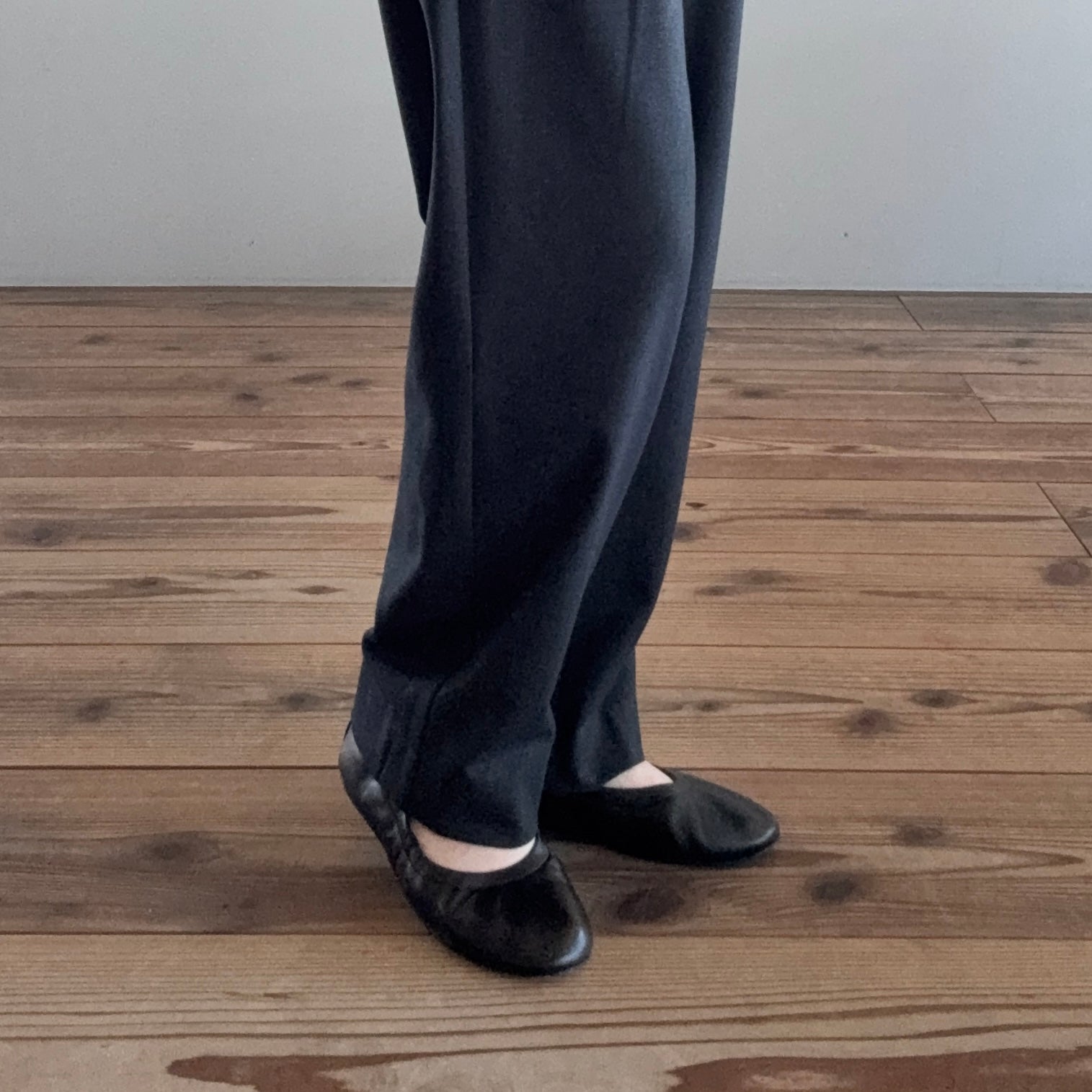 ほんのり裾に向かって窄まっているデザインの、スラリと見えるすっきりワイドシルエットがこだわりです。