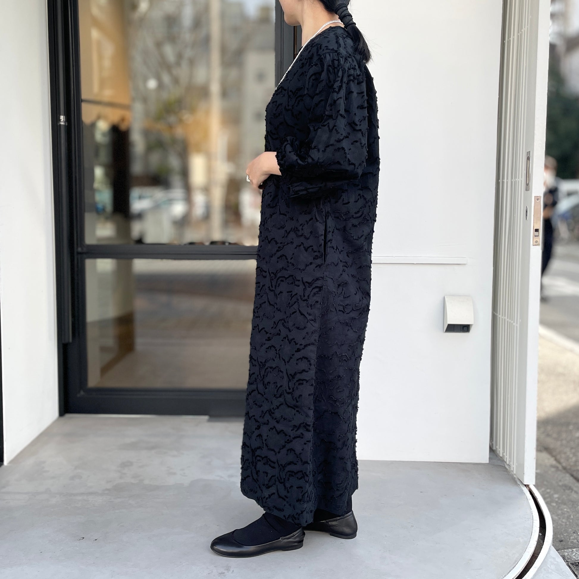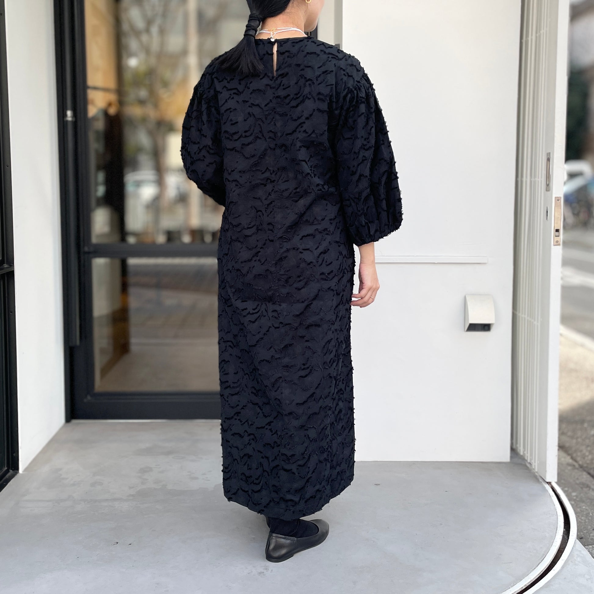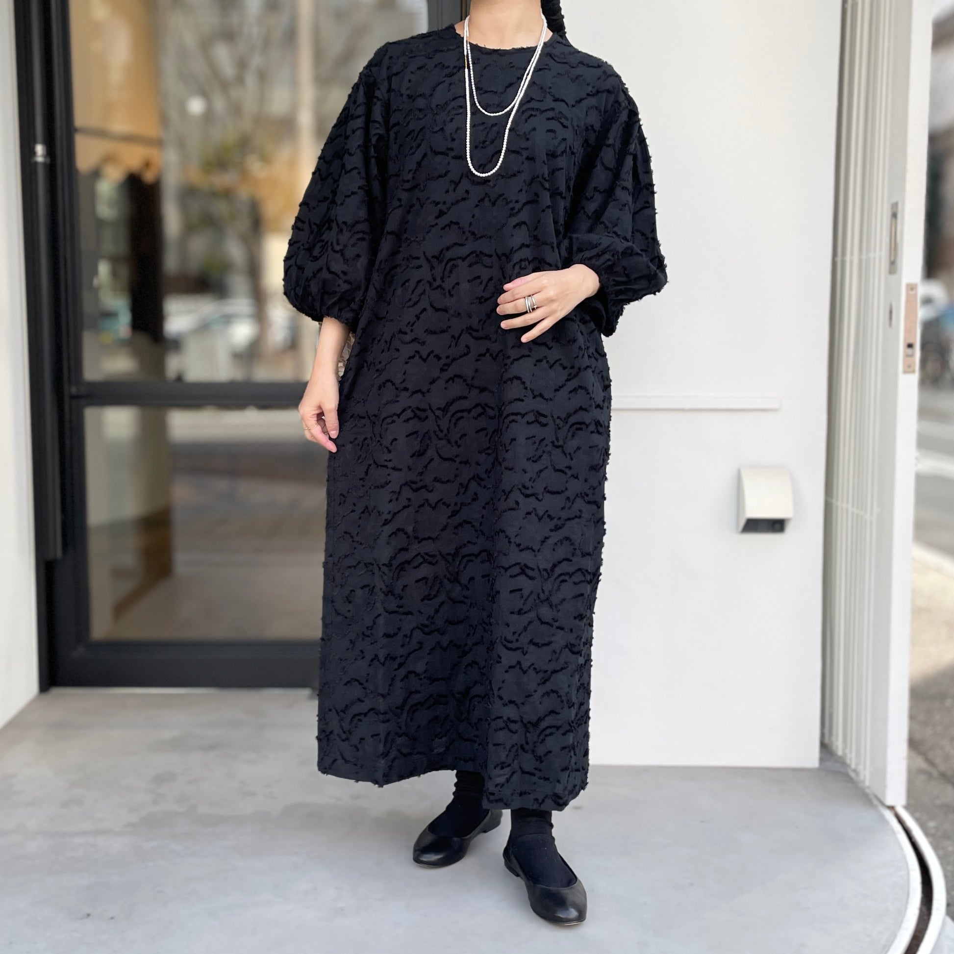 同色のジャガード柄とボリューム袖が目を引くワンピース。ジャガードはループヤーンやふわふわした無撚糸のブークレ調組織を組み合わせて凸凹を表現。綺麗めでありながら大人可愛い雰囲気があります。たっぷりとした8分袖のデザインも魅力的です。両脇にスラッシュポケット付きで、後ろ1つ釦開き。軽い着心地で通年活躍してくれます。オケージョンとしても使え、インナーや羽織りを変えれば普段使いにも使えるアイテムです。