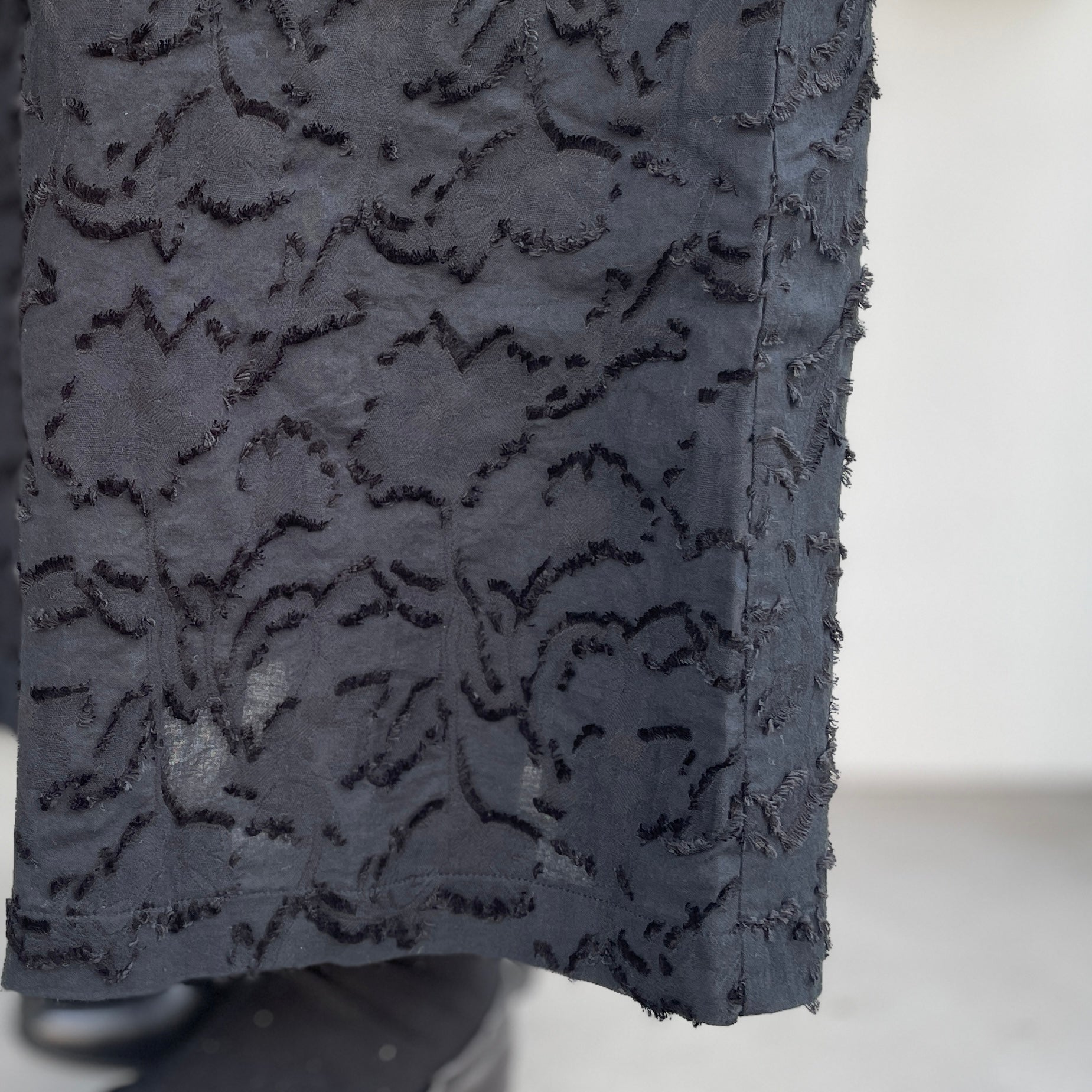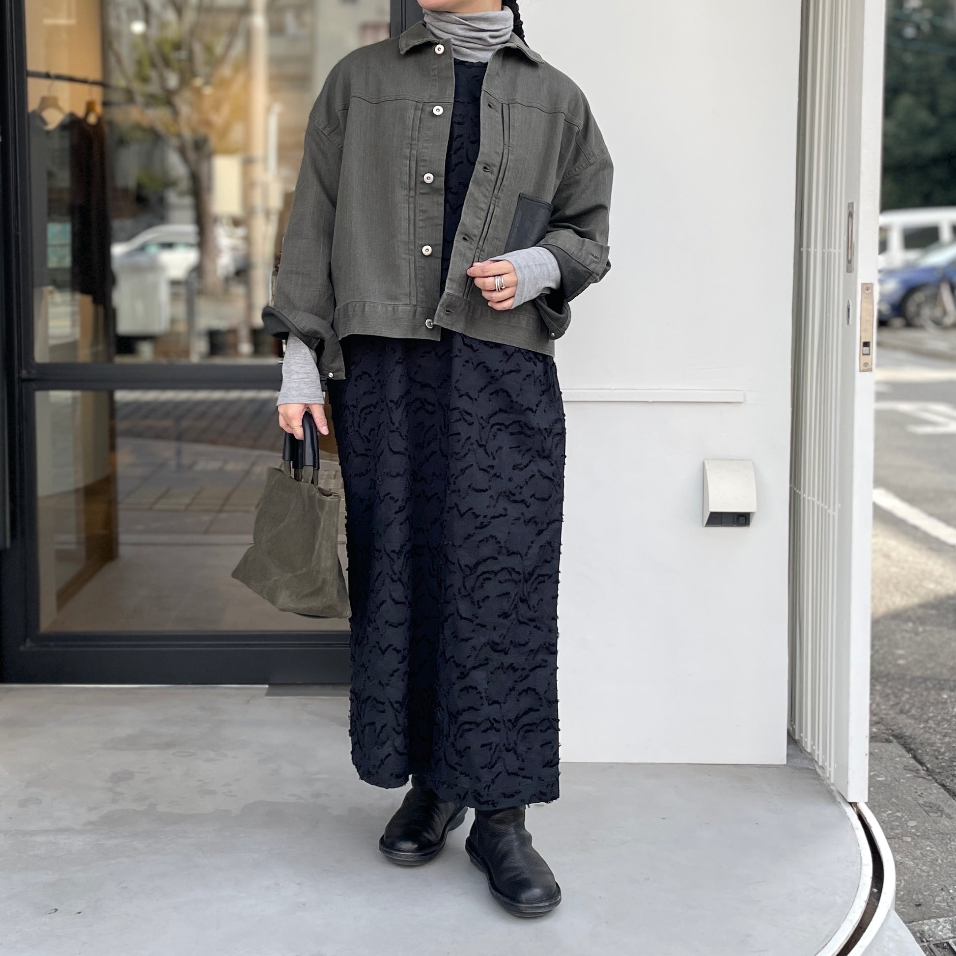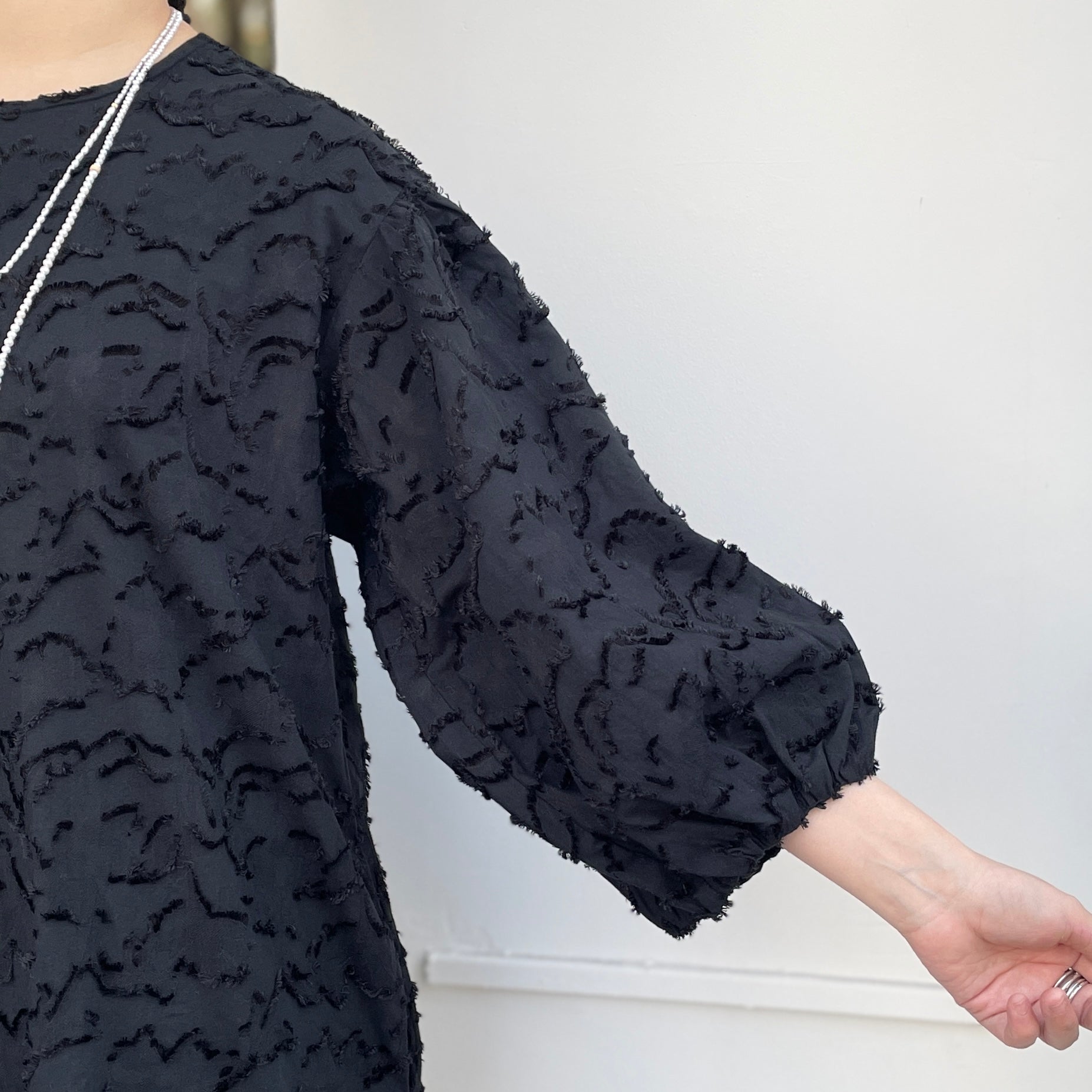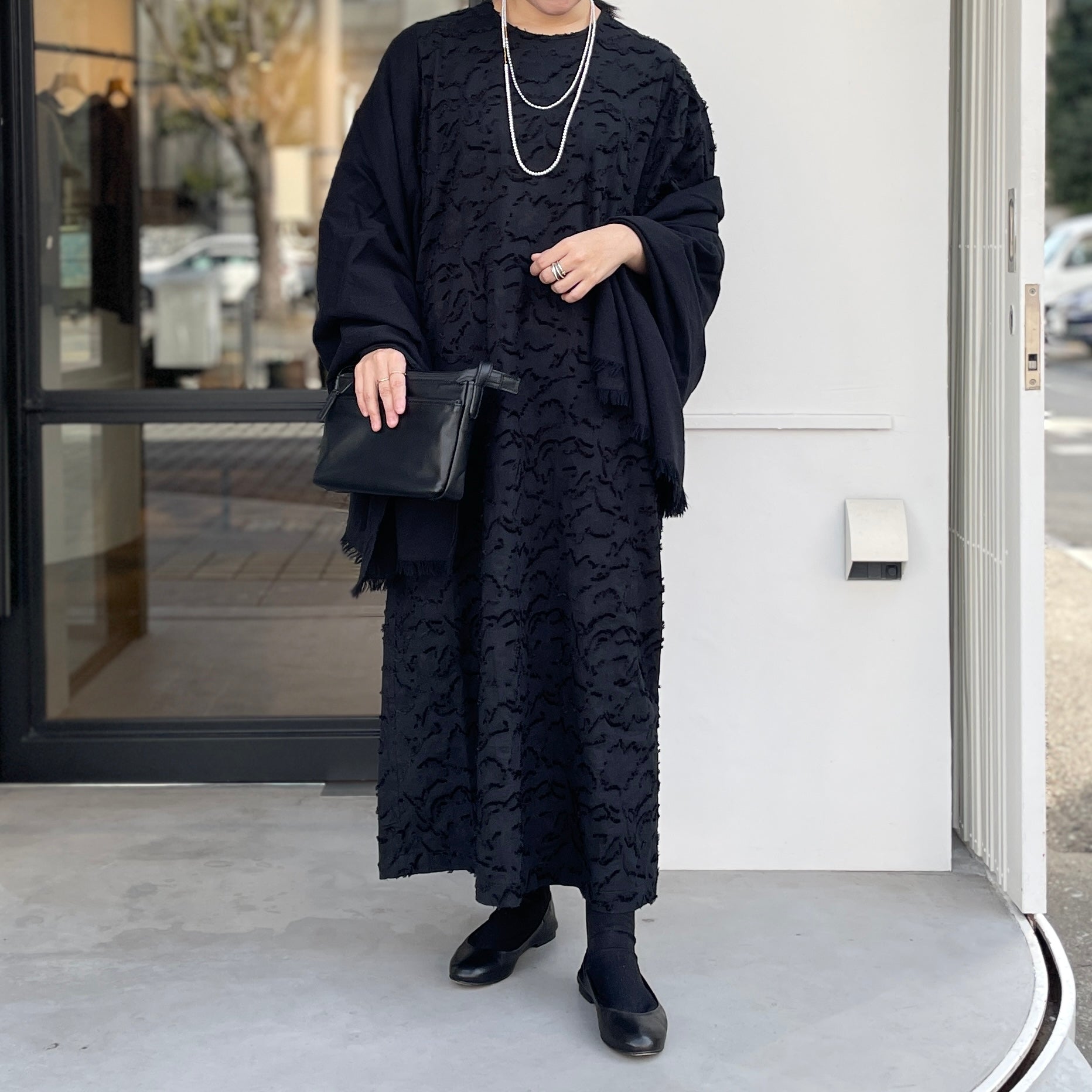同色のジャガード柄とボリューム袖が目を引くワンピース。ジャガードはループヤーンやふわふわした無撚糸のブークレ調組織を組み合わせて凸凹を表現。綺麗めでありながら大人可愛い雰囲気があります。たっぷりとした8分袖のデザインも魅力的です。両脇にスラッシュポケット付きで、後ろ1つ釦開き。軽い着心地で通年活躍してくれます。オケージョンとしても使え、インナーや羽織りを変えれば普段使いにも使えるアイテムです。