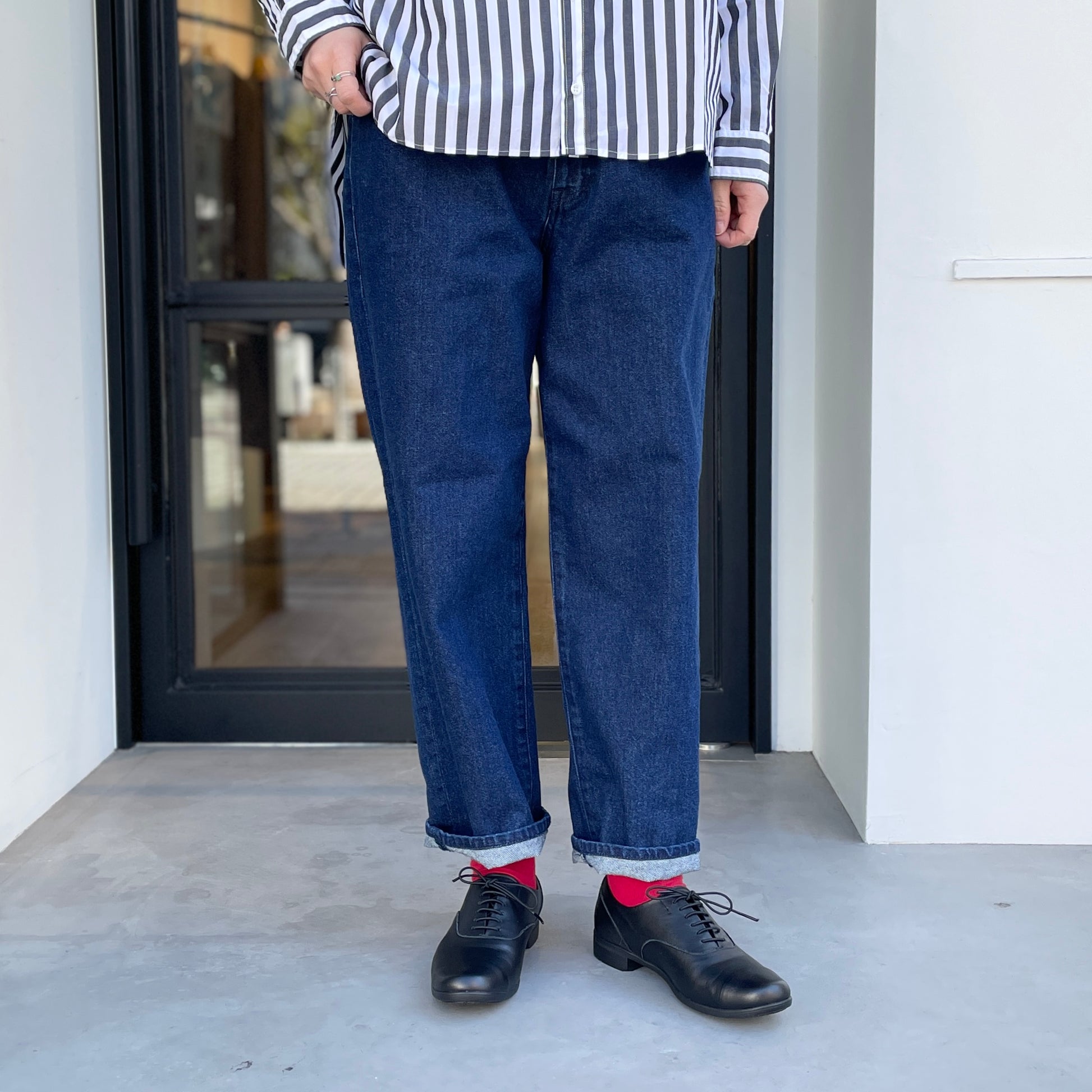 UNIVERSAL TISSUの定番アイテム、コットン100%のデニムパンツ。ゆるやかなテーパード型でだぼっともせず、ピタピタっともしない、履きやすい形です。デニムの産地、岡山県児島で加工されており、仕上げの際に製品洗いをすることで履き込んだような柔らかさだったり独特な素材感と雰囲気を表現しております。ウエスト後方はゴム仕様で、裾も長すぎないため小柄さんにもおすすめな1本です。